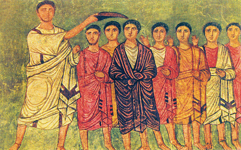 שמואל הנביא מושח את דוד הנער למלך. ציור פרסקו תנ"כי מדורה אורופוס ,בית כנסת עתיק בסוריה,המאה השלישית לספירה.