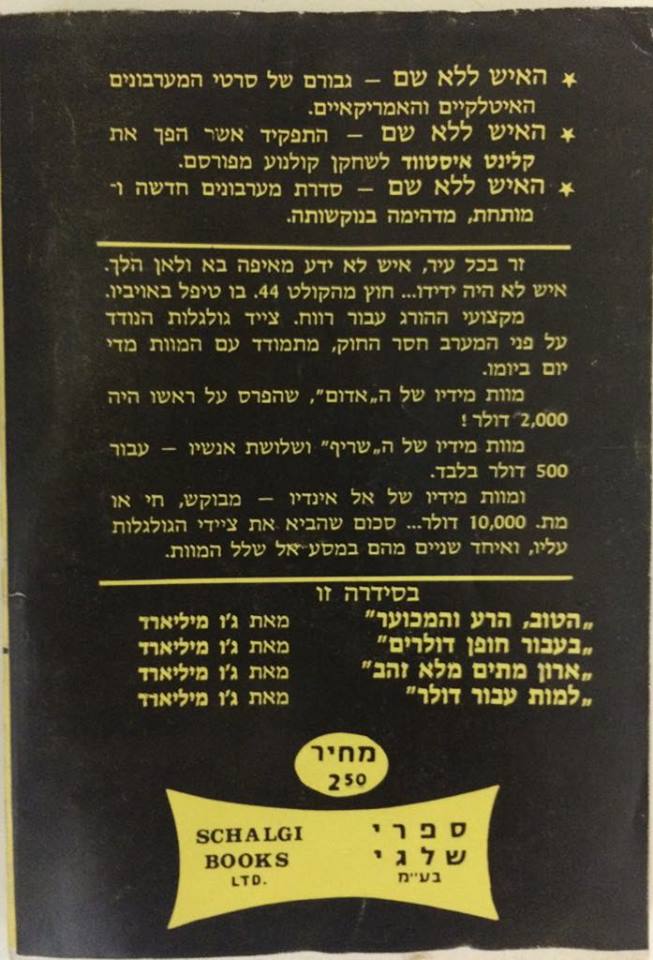 הטוב הרע והמכוער. עברית אלישע  בן מרדכי.  גבר ללא שם : המערבון המרתק) (תל אביב) : ספרי שלגי, (1972).