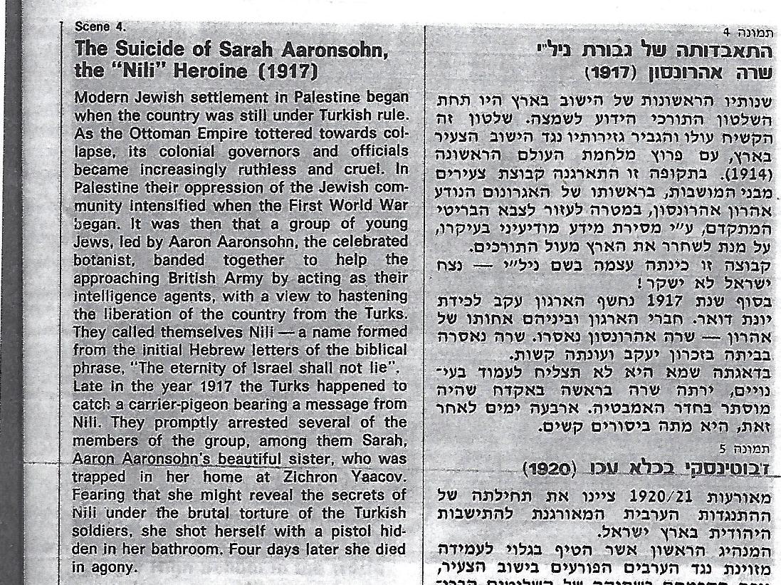 שרה אהרונסון מתאבדת. האמבט אינו  שחזור של האמבט האמיתי שבו התאבדה בזכרון יעקב. זהו אמבט עתיק אמיתי שנמצא בבית שעמד להריסה בכרכור לאחר חיפושים רבים.