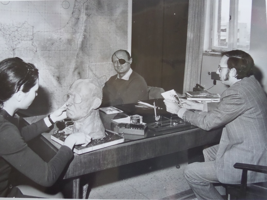 משה דיין מעוצב כפסל שעווה בידי פסלת סינית יפה ביחד עם שי מאיר היזם.