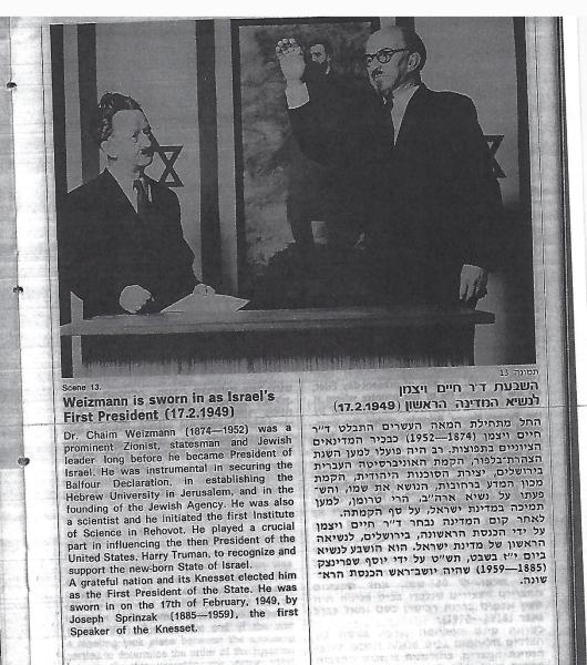 מצגת מתחלפת : בן גוריון  מקריא את מגילת העצמאות  בבגד המקורי שאותו  תרם בן גוריון למוזיאון. ואז המצגת מתחלפת לבן גוריון מניק גדי  מתוך בקבוק של תינוקות בשדה בוקר. וחוזר חלילה לאין סוף.